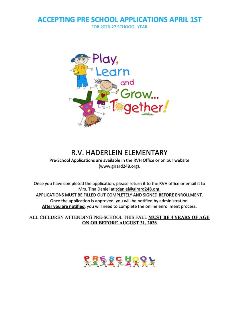 R.V. Haderlein Elementary will start accepting preschool applications for the 2026-27 school year on April 1st.